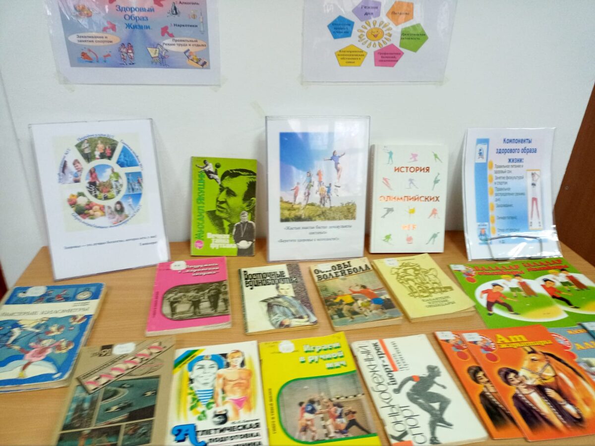 На выставке представлена литература по разделам: «История олимпийских игр», Е.Сағындықов «Қазақтың тұлттық ойындары», «Ю.К. Сорокин «Атлетическая подготовка допризывника», М. Якушин «Вечная тайна футбола», А.В. Седов «Быстрые килимеры», Е.А. Малков «Подружись с Королевой спорта», «Олимпийский глобус», И. Оранский «Восточные единоборства», Ч.Л. Гарбаляускас «Играем в ручной мяч»,»Конкобежный спорт», «Основы волейбола», «Қазақтың бес алабы», «Балалар ойындары», «Ат жарыстары», «Ужас наркомании», «Семейное воспитание».