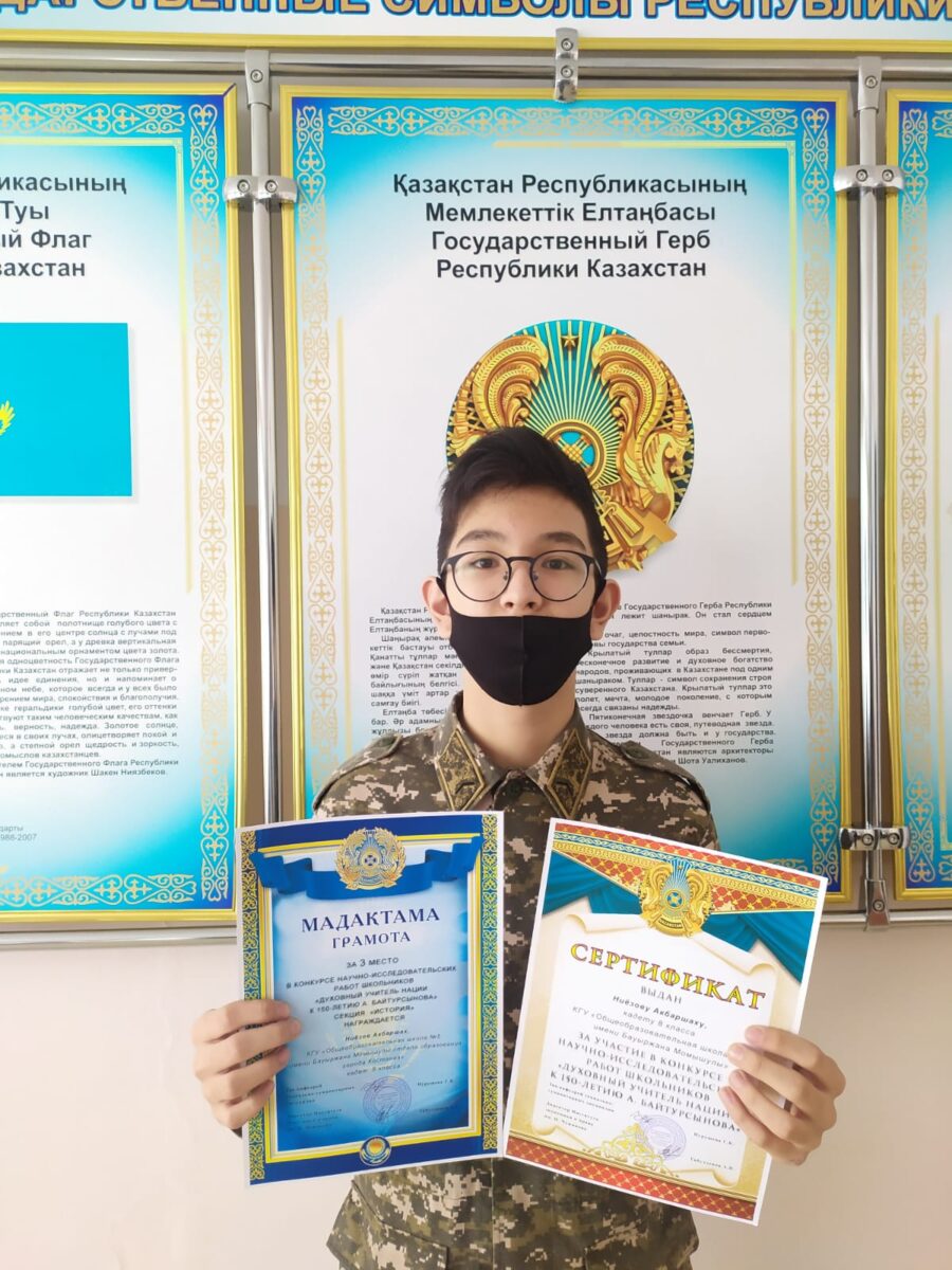 В рамках ориентации подрастающего поколения на отечественную историю и укрепления гражданской идентичности молодежи, на прошедшем областном конкурсе научно-исследовательских работ по истории Казахстана под названием «Духовный Учитель нации. К 150-летию А. Байтурсынова» среди учащихся общеобразовательных школ наши ученики, кадет 8Б класса Ниёзов Акбаршах и ученица 9В класса Часовская Ольга заняли 3 места в номинациях «История Казахстана» и «Краеведение» соответственно. Научная работа кадета Ниёзова А. посвящена была военным мемуарам легендарного военного стратега Бауыржана Момышулы, как источникам изучения военного искусства. Научные изыскания Часовской О. концентрировались вокруг проблемы развития системы образования в Костанайской области. Организаторы конкурса в лице кафедры социально-гуманитарных дисциплин Костанайского регионального университета им. А. Байтурсынова, в составе жюри которой вошли ведущие историки-исследователи региона, д.и.н., профессор Айтмухамбетов А.А., д.и.н., профессор Легкий Д.М., кандидат исторических наук Исмаилов С.С., доктор PhD Ибраев Е.Е. отметили сертификатами и грамотами участников и призеров, а также научного руководителя учащихся учителя истории и основ права Дулатова Б.К.