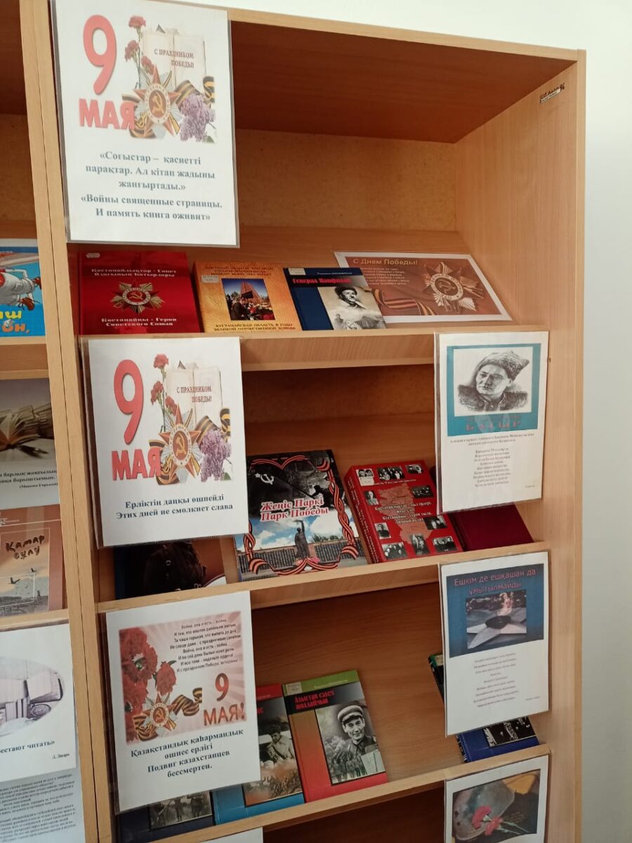 9 мамыр – біздің еліміздің тарихындағы ерекше күн. Біз Ұлы Жеңістің 76 жылдығын тойлап жатырмыз, ол үшін өмірін бергендердің бәрін еске аламыз. Біздің кітапханада осы күнге арналған «Соғыстардың қасиетті беттері. Кітап жадыны жанғыртады ». Онда Ұлы Отан соғысының тарихы туралы, Ұлы Отан соғысына қатысушылардың қаһармандары туралы, Қостанай облысының тылдағы батырлары туралы, ұлы қолбасшы, Кеңес Одағының батыры, жазушы Бауыржан Момышұлының шығармалары ұсынылған.Бұл Ұлы Отан соғысының маңызды оқиғалары туралы, кеңес халқының фашизмге қарсы күресі туралы баяндайтын кітаптар.