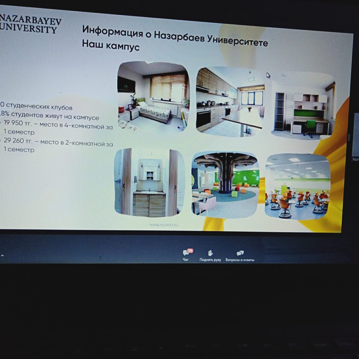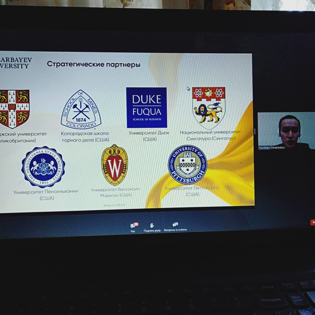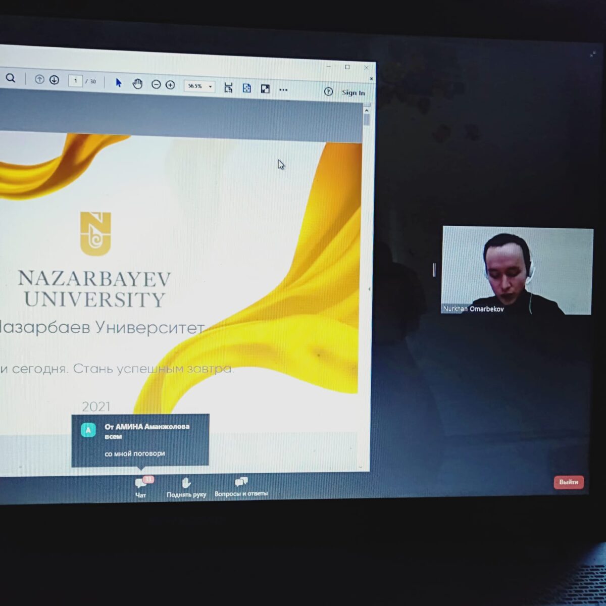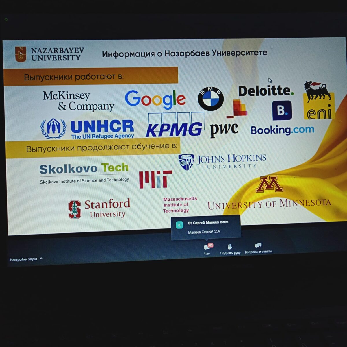 NAZARBAYEV UNIVERSITY атынан Омирхан Омарбековпен қашықтықтан кәсіби бағдар беру жұмысы өтті. Ұраны:”Бүгін түс, ертең сәтті бол”. Ол мектеп түлектеріне бұл заманауи университет екенін және студенттердің жұмыстары студенттердің зерттеулеріне бағытталғанын айтты. Университет студенттерді Халықаралық тағылымдамаларға дайындайды, оқу үшін ғылыми мақалалар жазу үшін әлемдік цифрлық кітапханаларға қолжетімділік бар. Оқуға толық және ішінара гранттар бар, студенттер өздері үшін кесте жасайды, және бұл оқытушылар студенттерге өз кестелерін жібереді және әр студент оқуға келетін уақыт пен оқытушыны таңдайды. Университетте Оқу ағылшын тілінде жүргізіледі.