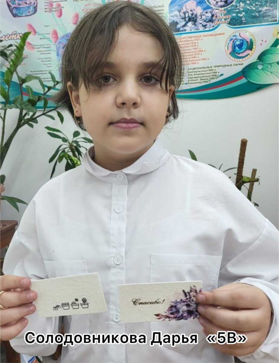 5 В сынып оқушысы Дарья Солодовникова “Медицина, психология, экология” секциясында 2 орын алды жоба жетекшісі Гаджиева Татьяна Александровна биология пәнінің мұғалімі, педагог-модератор.