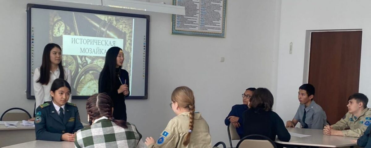 28 қараша күні тарих және география онкүндігі аясында тарих пәнінің мұғалімдері Д.А.Базылжанова мен А.Е.Чугулева 8-сынып оқушылары арасында «Тарихи мозаика» интеллектуалды ойынын өткізді. Ойын барысында балалар Қазақстан тарихына қатысты сұрақтарға белсенді түрде жауап берді, тарихи қолтырауын ойнады, тарихи тұлғалардың портреттерінің мозаикаларын жинады, сонымен қатар көшпенділердің әдет-ғұрыптары мен дәстүрлерін сахналады.